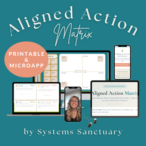 The Aligned Action Matrix is a one-page prioritization tool that replaces urgency with energy and importance with impact. Instead of sorting tasks by what’s screaming loudest, you sort them by what actually moves your business forward while honoring how your body feels today.